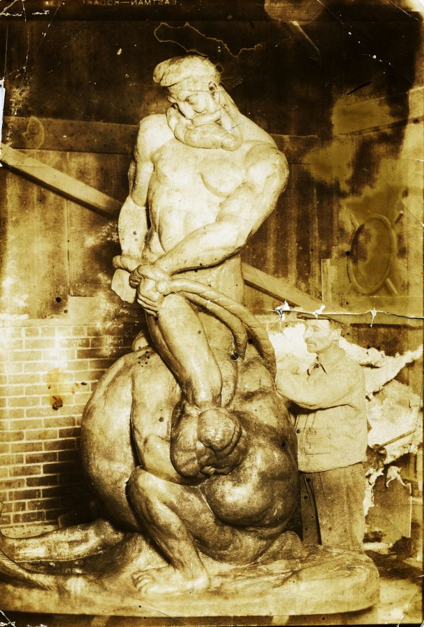 This statue of a muscular godlike figure (for which I definitely did not pose, subject matter unknown but I am guessing Lacaooen) is almost certainly from Grandpa’s time as a professor at Antioch College in Yellow Springs, Ohio. I’ve been told it adorns, or did adorn, the Cleveland Museum of Art. My grandfather created many smaller clay, plaster, and bronze sculptures, including at least one of a basketball player (in a two-handed set-shot pose), the first sport Giovanni took a shine to in the United States. After about three years in Ohio, Giovanni moved his family to Brooklyn, where he became a keen follower of the Dodgers. Later, living in the Bronx (and always a Dodgers fan), Grandpa was quick to point out that Roy Campanella, the great African-American catcher of the Dodgers, actually had to be part-Italian with the name “Campanella.”